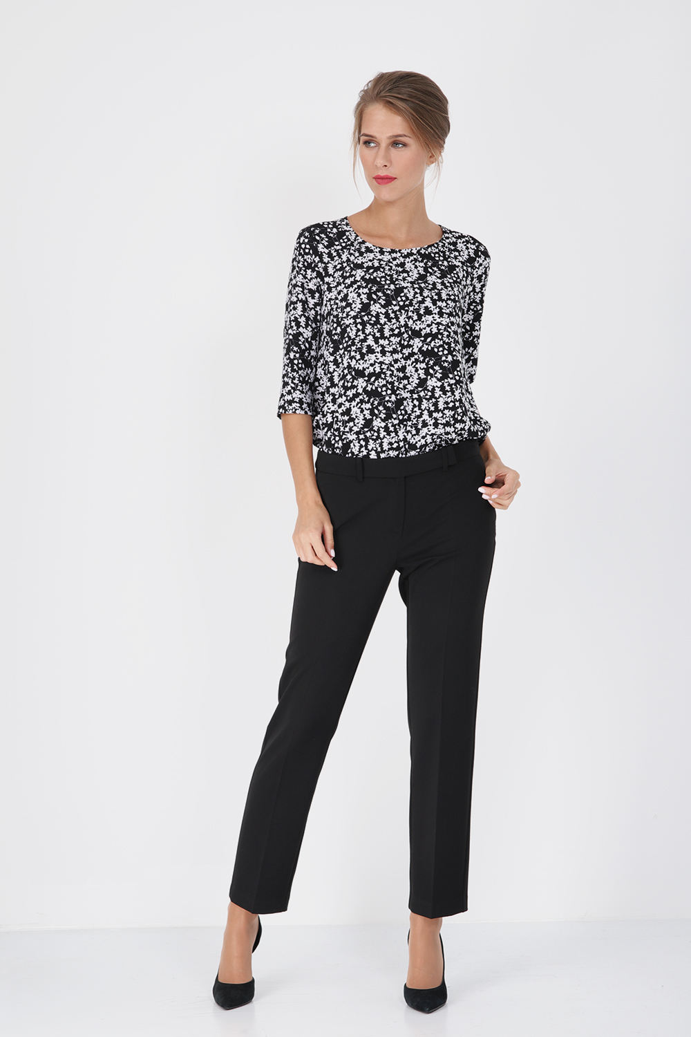Классические брюки – один из символов элегантности и хорошего вкуса их обладательницы. Брюки лаконичного кроя дополнены строгими стрелками. Изделие на притачном поясе с застежкой на молнию и крючок. Боковые карманы с фигурным входом. На задних половинках брюк имитация прорезных карманов в рамку.