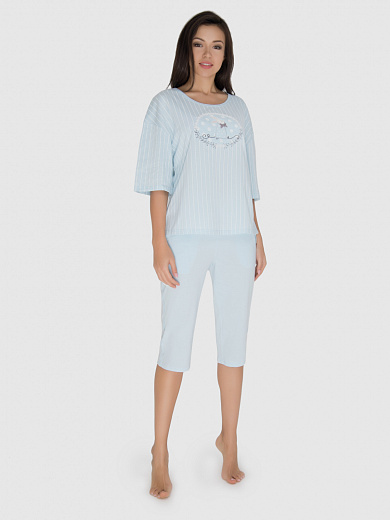 Комфортная пижама из хлопкового полотна с нежной полоской, состоящая из футболки и бриджей. Футболка расширенного силуэта с рукавами 3/4. Украшение полочки - очаровательная вышивка в стиле французского прованса. Бриджи прямого фасона, слегка заужены к низу, в боковых швах отделка декорированны кантом и карманы.