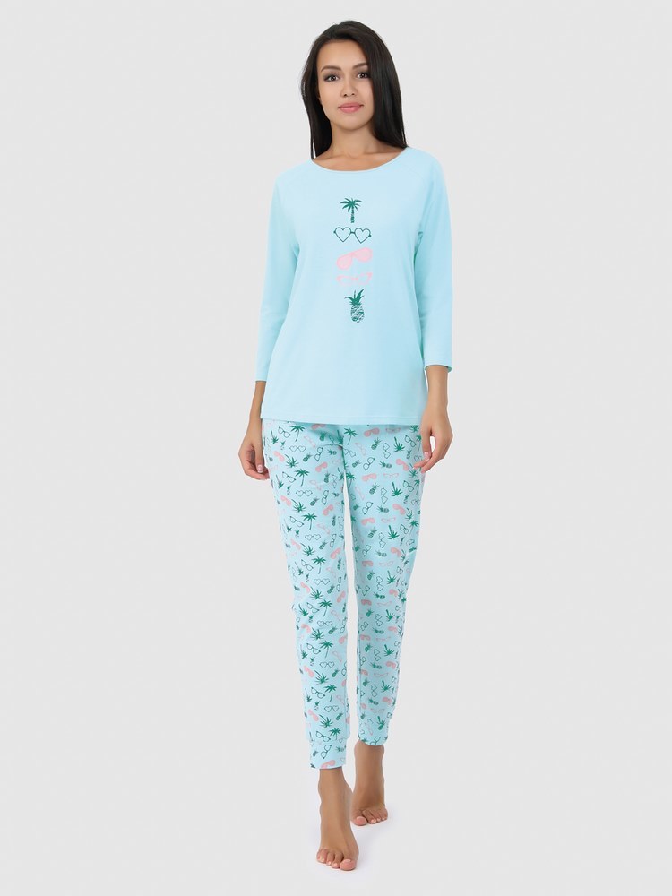 Молодежная пижама, состоящая из футболки и брюк. Футболка полуприлегающего силуэта с рукавом-реглан 3/4. На полочке очаровательный принт. Брюки с манжетами с мелким контрастным принтом.