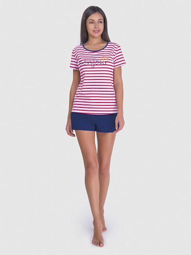 Эффектный комплект для дома и отдыха, состоящий из футболки прямого силуэта с коротким рукавом и шорт. Футболка запринтована красной полоской, на полочке принт "Bonjour".
