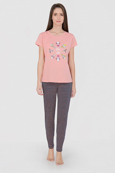 Оригинальный комплект для дома и отдыха, состоящий из футболки и брюк. Футболка прямого силуэта с коротким рукавом, на полочке очаровательный принт "Рыбки". Нежнейшие трикотажные брючки из принтованного полотна с горизонтальной полоской.